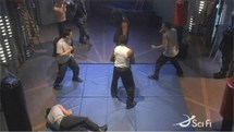 Большая комната с красивыми витражными окнами и раздвигающимися дверями. Тут любят потренироваться