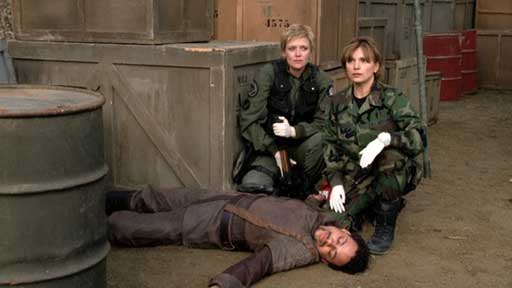 Джаффа и СГ-1 помогли Ток'ра эвакуироваться на новую базу. По дороге им пришлось задержаться на какой-то планете как на перевалочном пункте. Во время простая наружу выползли их внутренние противоречия, взаимная неприязнь и недоверие. Оказалось, Джаффа считают, что Ток'ра ничем не лучше Гоа'улдов - те же паразиты, а Ток'ра не могут заставить себя воспринимать Джаффа как равных и относятся к ним как к слугам. Позже, когда нашли убитого Ток'ра, подозрение, естественно, пало на одного из Джаффа - незадолго до убийства все видели их ссору. Джаффа посадили в клетку под замок, но через некоторое время его тоже обнаружили мертвым. Несмотря на то, что его все время охраняли, убийцу никто не видел. Само собой, тут СГ-1 вспомнили про технологию Ниррти, однако Ток'ра рассказали, что такой же технологией обладает Ашрак - наемный убийца Гоа'улдов. Дальше сначала вся толпа попыталась найти невидимку вслепую - так погибли еще несколько человек, а потом Картер придумала, как создать помехи для устройства, обеспечивающего невидимость. Как только ей удалось собрать и запустить устройство, Ашрак стал виден, и его убили. В финале Бра'так сообщил, что нож, обагренный кровью Ток'ра, Джаффа и Таури, сделал их всех братьями для совместного противостояния общему врагу. | |
